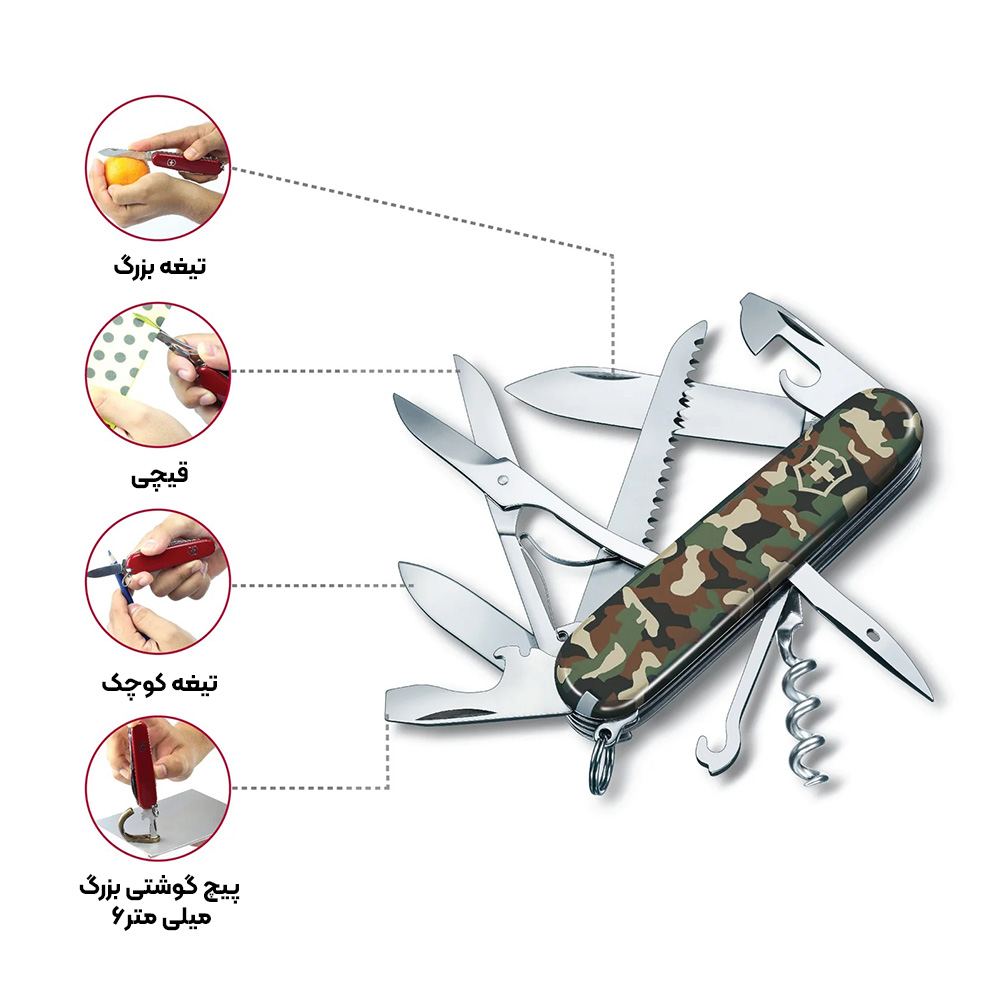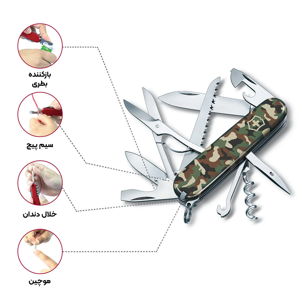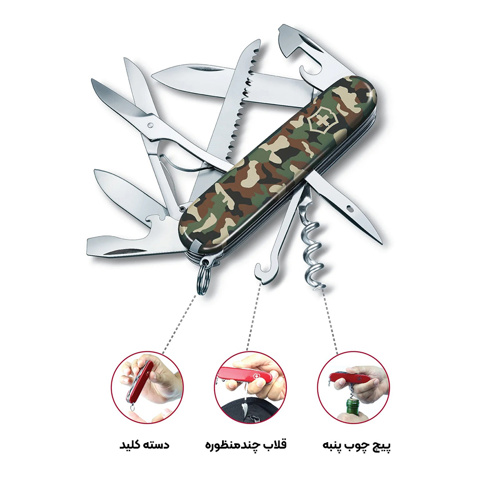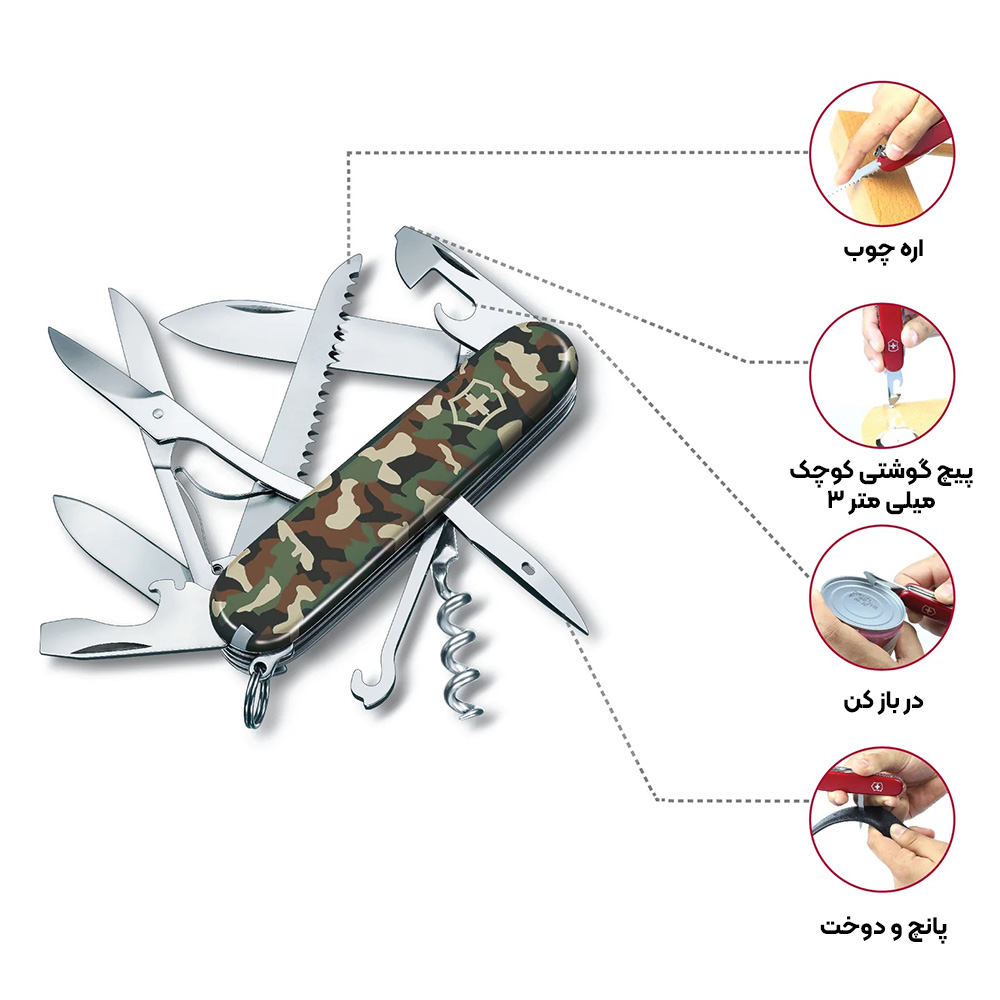 مشخصات این چاقو عبارتند از: تیغه بزرگ، تیغه کوچک، چسبانک، باز کننده قوطی، مته برقی کوچک، باز کننده قوطی، مته برقی، خراطی سیم، تیغه تیز کننده و سوراخ کاری، حلقه کلید، چنگش، دندانه گیر، قیچی، قلاب چند منظوره و اره چوب. با این توابع متنوع، این چاقوی جیبی سوئیسی شما را در بسیاری از فعالیتها و وظایف روزمره همراهی میکند.