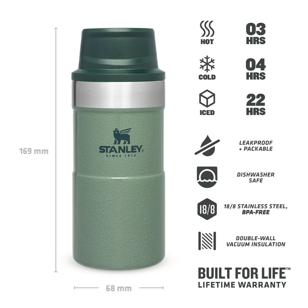 تراول ماگ دکمه‌دار 250 میلی‌لیتری استنلی مدل Classic Trigger Action Travel Mug، یک محصول بی‌نظیر و بسیار کاربردی در سفر، طبیعت‌گردی، کوه‌نوردی و سایر ماجراجویی‌ها به حساب می‌آید. این کمپانی از ابتدا به هدف ارائه محصولات با طول عمر بالا به نیروهای دریایی و هوایی متمرکز شده است. به گونه‌ای که محصولات آن می‌توانند در شرایط سخت و بدون تغییر کیفیت، با دمای ۷۰- درجه سانتی‌گراد، طوفان‌های شدید، افتادن از ارتفاع ۱۲۰۰ متری و حتی اصابت گلوله مقاومت کنند.